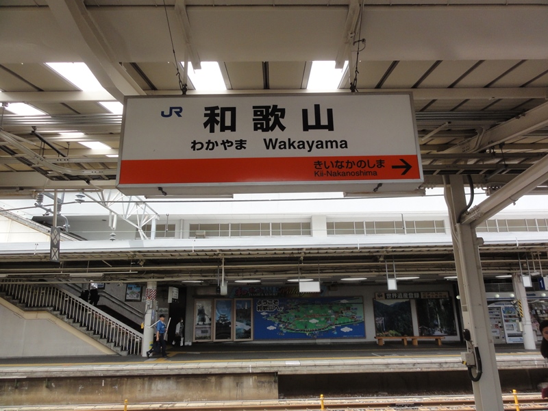 和泉府中駅で関空・紀州路快速に乗り換えます。ホームに入ってきた列車の種別幕には、最近導入された路線記号の表記がありました。また、和歌山駅では前回訪れたときとの違いに、トイレが新しくなっていたほか、発車標の外装が大阪駅のような黒地のものとなっており路線図記号も表記されていました。